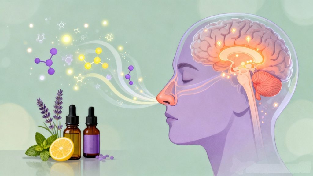Secara kimia, minyak atsiri tersusun atas senyawa volatil seperti terpenoid, alkohol, ester, dan aldehida. Ketika dihirup, molekul aroma akan berikatan dengan reseptor olfaktori dan mengirimkan sinyal langsung ke sistem limbik, bagian otak yang berperan dalam emosi, memori, dan respons stres (Herz, 2009). Jalur ini menjelaskan mengapa aroma dapat memicu perubahan suasana hati dalam waktu singkat.